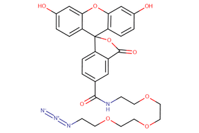The water soluble 5-FAM PEG3 azide has a long PEG3 spacer that separates the dye carboxyfluorescein (commonly known as FAM) from the terminal azide group. The water-soluble PEG3 spacer should minimize the interaction between the dye and the biomolecule to be labeled. 5-FAM PEG3 azide is an excellent alkyne-reactive fluorescent reagent for labeling alkyne-containing biological molecules through click chemistry. Reference:
