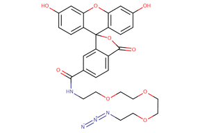 The water soluble 6-FAM PEG3 azide has a long PEG3 spacer that separates the dye carboxyfluorescein (commonly known as FAM) from the terminal azide group. The water-soluble PEG3 spacer should minimize the interaction between the dye and the biomolecule to be labeled. 6-FAM PEG3 azide is an excellent alkyne-reactive fluorescent reagent for labeling alkyne-containing biological molecules through click chemistry. Reference: