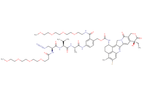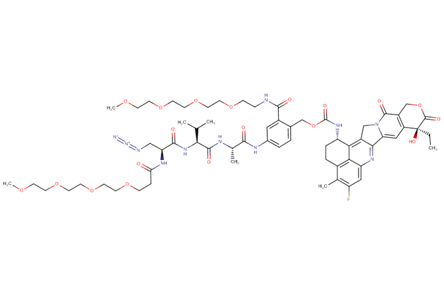 SOLU-KNEX® cleavable linker features a Val-Ala dipeptide. In this product, a Azide-Dap(m-PEG4) moiety replaces the conventional maleimidocaproyl (MC) unit to enhance aqueous solubility. The azide functional group is widely utilized in bioconjugation via click chemistry to enable efficient and selective attachment of biomolecules. Additionally, m-PEG4 is attached to the commonly used self-immolative para-aminobenzyl (PAB) moiety to further increase aqueous solubility. The payload is Exatecan, a highly potent topoisomerase I inhibitor derived from camptothecin, which induces DNA damage by stabilizing the topoisomerase I–DNA complex, resulting in cell-cycle arrest and apoptosis.