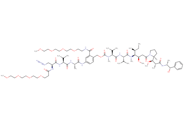 SOLU-KNEX® cleavable linker features a Val-Ala dipeptide. In this product, a Azide-Dap(m-PEG4) moiety replaces the conventional maleimidocaproyl (MC) unit to enhance aqueous solubility. The azide functional group is widely utilized in bioconjugation via click chemistry to enable efficient and selective attachment of biomolecules. Additionally, m-PEG4 is attached to the commonly used self-immolative para-aminobenzyl (PAB) moiety to further increase aqueous solubility. The payload is monomethyl auristatin E (MMAE), a highly potent antimitotic agent that inhibits tubulin polymerization, leading to cell-cycle arrest and subsequent apoptosis.
