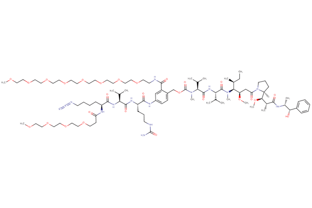 SOLU-KNEX® cleavable linker features a Val-Cit dipeptide. In this product, a Azide-Lys(m-PEG4) moiety replaces the conventional maleimidocaproyl (MC) unit to enhance aqueous solubility. The azide functional group is widely utilized in bioconjugation via click chemistry to enable efficient and selective attachment of biomolecules. Additionally, m-PEG8 is attached to the commonly used self-immolative para-aminobenzyl (PAB) moiety to further increase aqueous solubility. The payload is monomethyl auristatin E (MMAE), a highly potent antimitotic agent that inhibits tubulin polymerization, leading to cell-cycle arrest and subsequent apoptosis.
