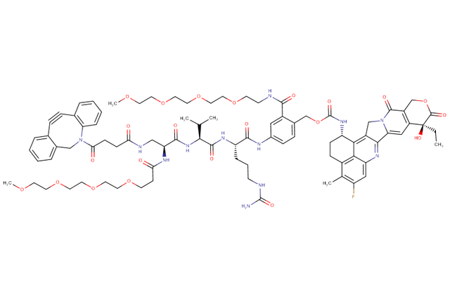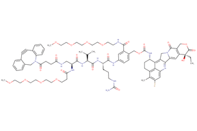 SOLU-KNEX® cleavable linker features a Val-Cit dipeptide. In this product, a DBCO-Dap(m-PEG4) moiety replaces the conventional maleimidocaproyl (MC) unit to enhance aqueous solubility. DBCO is a strained alkyne commonly used in copper-free click chemistry, specifically in the strain-promoted azide-alkyne cycloaddition (SPAAC) reaction. Additionally, m-PEG4 is attached to the commonly used self-immolative para-aminobenzyl (PAB) moiety to further increase aqueous solubility. The payload is Exatecan, a highly potent topoisomerase I inhibitor derived from camptothecin, which induces DNA damage by stabilizing the topoisomerase I–DNA complex, resulting in cell-cycle arrest and apoptosis.