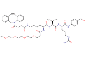 SOLU-KNEX® cleavable linker features a Val-Cit dipeptide. In this product, a DBCO-Lys(m-PEG4) moiety replaces the conventional maleimidocaproyl (MC) unit to enhance aqueous solubility. DBCO is a strained alkyne commonly used in copper-free click chemistry, specifically in the strain-promoted azide-alkyne cycloaddition (SPAAC) reaction.