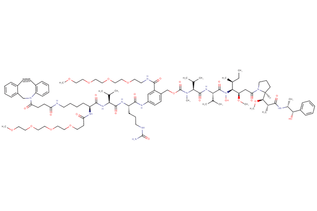 SOLU-KNEX® cleavable linker features a Val-Cit dipeptide. In this product, a DBCO-Lys(m-PEG4) moiety replaces the conventional maleimidocaproyl (MC) unit to enhance aqueous solubility. DBCO is a strained alkyne commonly used in copper-free click chemistry, specifically in the strain-promoted azide-alkyne cycloaddition (SPAAC) reaction. Additionally, m-PEG4 is attached to the commonly used self-immolative para-aminobenzyl (PAB) moiety to further increase aqueous solubility. The payload is monomethyl auristatin E (MMAE), a highly potent antimitotic agent that inhibits tubulin polymerization, leading to cell-cycle arrest and subsequent apoptosis.