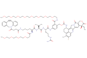 SOLU-KNEX® cleavable linker features a Val-Cit dipeptide. In this product, a DBCO-Lys(m-PEG4) moiety replaces the conventional maleimidocaproyl (MC) unit to enhance aqueous solubility. DBCO is a strained alkyne commonly used in copper-free click chemistry, specifically in the strain-promoted azide-alkyne cycloaddition (SPAAC) reaction. Additionally, m-PEG4 is attached to the commonly used self-immolative para-aminobenzyl (PAB) moiety to further increase aqueous solubility. The payload is Exatecan, a highly potent topoisomerase I inhibitor derived from camptothecin, which induces DNA damage by stabilizing the topoisomerase I–DNA complex, resulting in cell-cycle arrest and apoptosis.