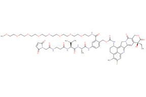 SOLU-KNEX® cleavable linker features a Val-Ala dipeptide. In this product, m-PEG8 is attached to the commonly used self-immolative para-aminobenzyl (PAB) moiety to increase aqueous solubility. The payload is Exatecan, a highly potent topoisomerase I inhibitor derived from camptothecin, which induces DNA damage by stabilizing the topoisomerase I–DNA complex, resulting in cell-cycle arrest and apoptosis.