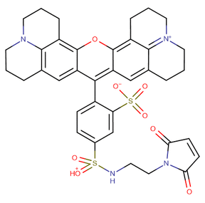 Sulforhodamine 101 C2 maleimide is an excellent thiol-reactive reagent for protein modifications. It reacts with thiol compounds such as amino acid, peptides and proteins to give bright red fluorescent conjugates that have the identical fluorescent spectral properties of Texas Red derived biopolymers, in particular, antibodies.
