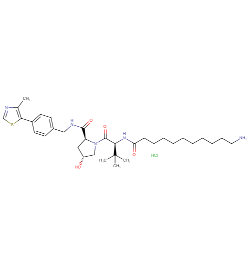 | SMILES | Cl.Cl.CC1=C(SC=N1)C1=CC=C(CNC(=O)[C@@H]2C[C@@H](O)CN2C(=O)[C@@H](NC(=O)CCCCCCCCCCN)C(C)(C)C)C=C1 |